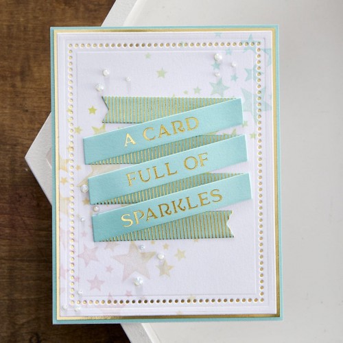 Sentiment Banner Glimmer Hot Foil Plate & Die Set maakt deel uit van de Spring into Glimmer-collectie. Met behulp van de drie dunne metalen stansen en het streepschaduwpatroon kun je een lintbanner maken met veel verschillende verijdelde zinnetjes. Er zijn 11 sentimentborden die je voor vele gelegenheden kunt mixen en matchen. Welke kies jij als eerste?