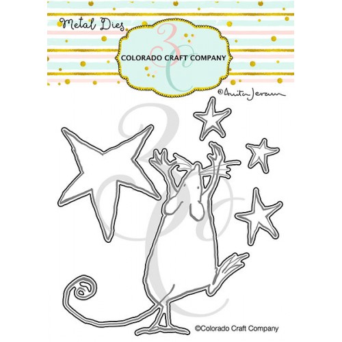 Reik naar de sterren met de Falling Star stempelset met de illustraties van Anita Jeram voor Colorado Craft Company. De set bevat fotopolymeerstempels met een muis die naar een ster reikt, afbeeldingen van 4 sterren van verschillende groottes en een stapel van 6 kleine sterren op een rij. De stempels kunnen worden gebruikt met de bijpassende Falling Star-stansset die apart wordt verkocht (AJ586-D).