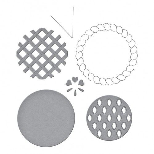 Sky View Pies Etched Dies maakt deel uit van de Pie Perfection Collection van Tina Smith. Deze set van zeven dunne metalen matrijzen kan worden samengevoegd tot een heerlijk bovenaanzicht van een volledig taartontwerp. Het bevat alles wat je nodig hebt, zelfs details zoals een taartopening, traliewerk, taartrand en meer!